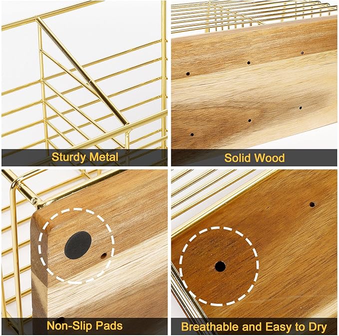 Utensil Holder for Kitchen Counter, Metal Utensil Holder Rack for Kitchen Countertop, Cooking Tools Storage for Spatula, Utensil Organizer with Sturdy Base, and Drainage Hole (Gold Wooden)