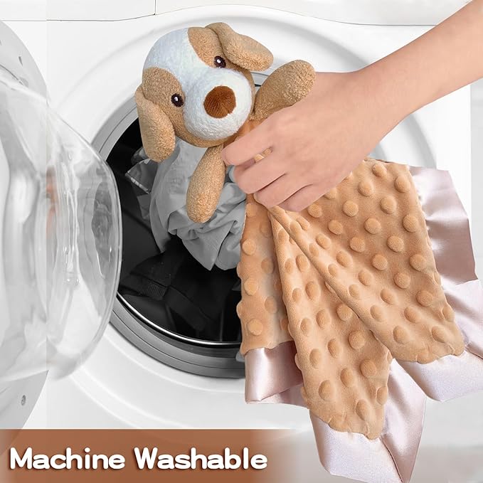 - đ¶ăPremium MaterialăMOVEPAI makes the highest quality lovey blankets with safety and healthy in mind. Great attention to detail goes into the production of each lovey. Unique textured plush and satin fabric with its realistic colors and fun & friendly animal designs which provides more tactile sensation for babies and enhances their sense of security and exploration. 16''x16'' dog's features are embroidered, with no plastic filling, taking care of your baby's health.