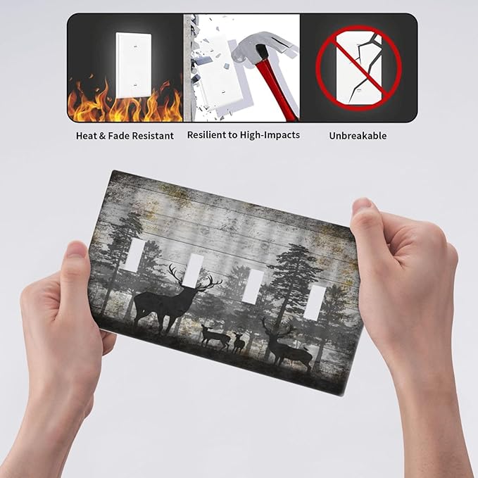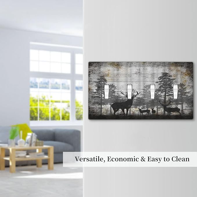 Rustic Deer Forest Vintage Wood Board Quad Toggle Boho Light Switch Covers Decorative Country Unique 4 Gang Wall Plate Electrical Faceplate Switchplate for Farmhouse Bedroom Decor