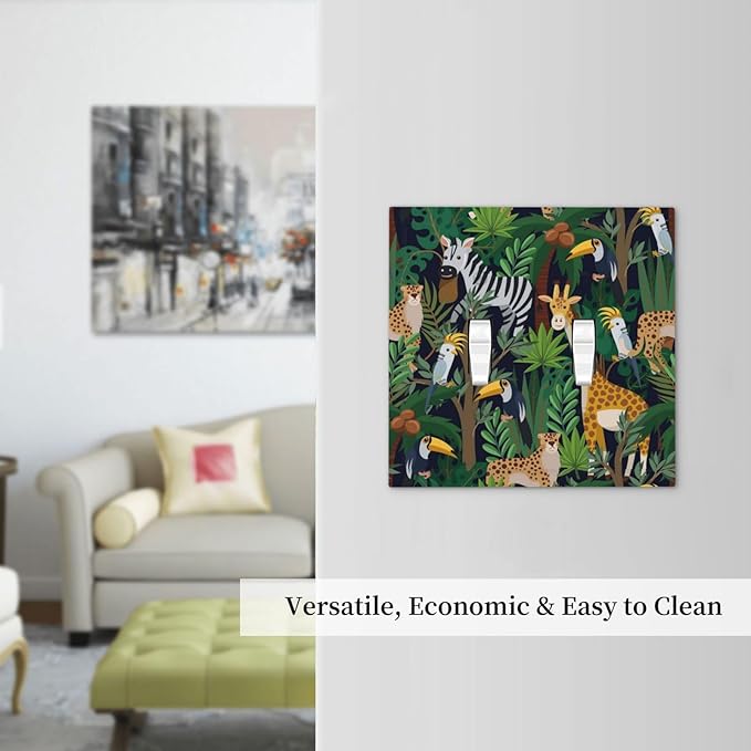 Cartoon Animal Zebra Leopard Giraffe Bird Leaf Double Toggle Nursery Light Switch Covers Decorative 2 Gang Wall Plate Dual Electrical Faceplate Switchplate for Kidroom Living Room Decor