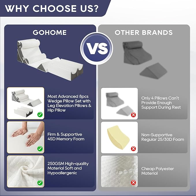 GOHOME 8pcs Orthopedic Bed Wedge Pillow Set for After Surgery, Memory Foam for Knee, Lumbar and Back Pain Relief Adjustable Support Pillows - Acid Reflux, Heartburn, Anti Snoring & GERD Sleeping