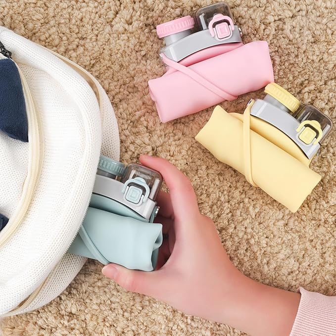 - 【LEAK PROOF AND EASY TO CLEAN】Collapse water bottles designed with silicone seal ring to prevent leakage. Wide mouth design makes collapsible water bottle easier to clean the interior and the narrow mouth prevents wetting when drinking water. When using for the first time, we advise to soak it for 30 minutes with boiled water for thorough cleaning.