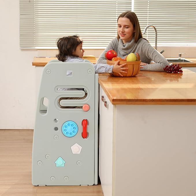 - Versatile Design for Growing Needs: With the option to remove the double safety rails as your child grows, this stool can transform into a versatile chair, adapting to your child's evolving requirements. Its unique game board design offers additional interactive features, including a Cup Holder, Toddler sensory toys, and Rotating gear games.