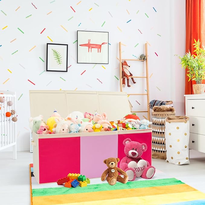 Large Toy Box Chest with Lid, Oxford Collapsible Sturdy Toy Storage Boxes Bins Baskets for Boys, Girls, Closet, Playroom, Nursery Room, 39"x15.5"x13" (Pink & Red)