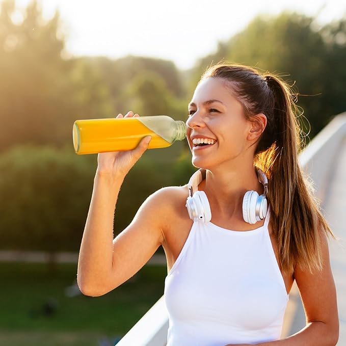- GLASS BOTTLES FOR JUICING AND MORE: Durable stainless steel lids with air and water-tight seals, so it’s completely airtight to keep your beverage fresh without any worry of spills. Throw this glass water bottle in your bag or car and get a healthy start to your day with a juice, smoothie, brew, ice tea, iced coffee, nut milk, milkshakes, Kombucha or water. The 100% leak proof glass bottle will never leave a leaky mess no matter how you place it. The clear glass helps you quickly spot the drink you're in the mood for.