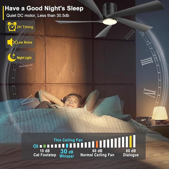 - Quiet DC Motor: Ohniyou black ceiling fan reduces power loss by 85%. smart ceiling fan operates below 30dB for a virtually noiseless, peaceful environment. the quiet ceiling fan can be timed for 2H for energy savings and convenient control