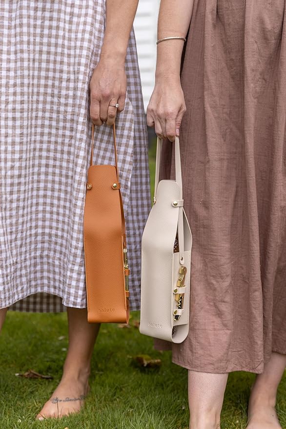 • Our beautifully crafted vegan Leather Wine Bottle Carriers are lightweight, durable and compact. They come with our signature gold corkscrew opener.