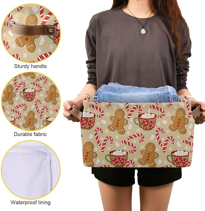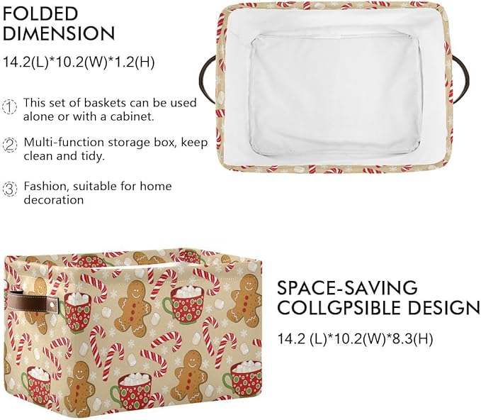 Christmas Gingerbread Man Storage Basket Fabric Kitchen Baskets Xmas Candy Cane Winter Snowflake Open Home Storage Bins Boxes Foldable Organizer Bag for Gift Book Shelf Closet Baskets 16×12×8 Inches
