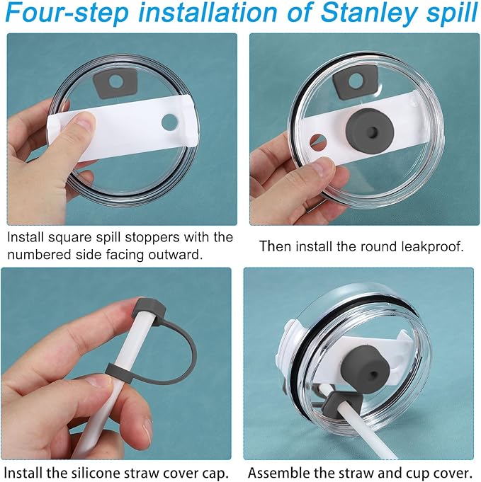 - Advantage: The spill stopper is made of silicone material, which is flexible, durable and convenient to clean. The straw cap can prevent water from spilling out of the straw and keep dust out. The round stopper is installed on the inner side of the cup lid, which ensures sealing while allowing air to enter for easy drinking. The square stopper is installed on the outer side of the cup lid, securing the straw in place and forming a seal to prevent leak.