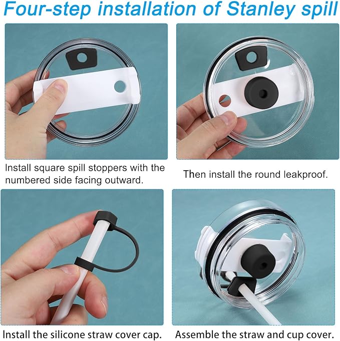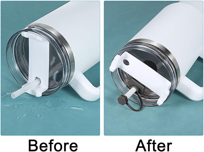 - Advantage: The spill stopper is made of silicone material, which is flexible, durable and convenient to clean. The straw cap can prevent water from spilling out of the straw and keep dust out. The round stopper is installed on the inner side of the cup lid, which ensures sealing while allowing air to enter for easy drinking. The square stopper is installed on the outer side of the cup lid, securing the straw in place and forming a seal to prevent leak.