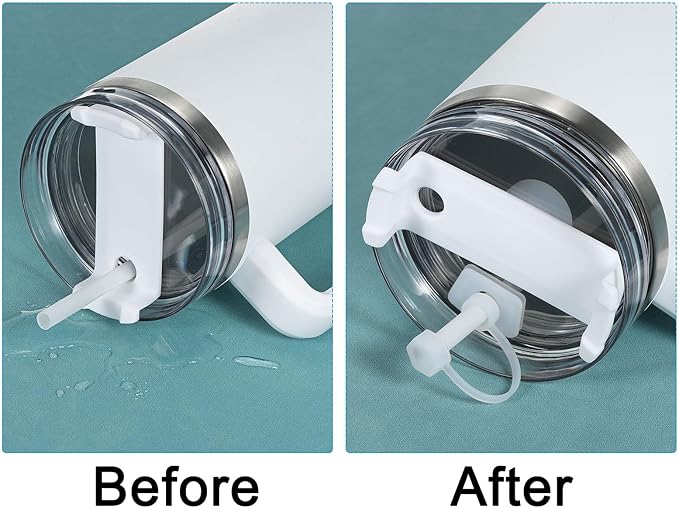 - Advantage: The spill stopper is made of silicone material, which is flexible, durable and convenient to clean. The straw cap can prevent water from spilling out of the straw and keep dust out. The round stopper is installed on the inner side of the cup lid, which ensures sealing while allowing air to enter for easy drinking. The square stopper is installed on the outer side of the cup lid, securing the straw in place and forming a seal to prevent leak.