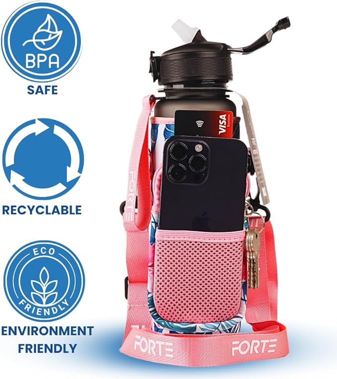 FORTE Plastic Water Bottle with Sleeve - BPA-Free Water Jug with Leak Proof Lid and Straw - Perfect for Gym, Office, and Everyday Use (Floral)