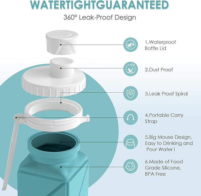 - Leakproof and Durable:Our reusable water bottle boasts a leakproof construction with a secure lid that prevents leaks and accidental spills. The lid and body are sealed with a secure leak proof seal, tightly fitting together to eliminate concerns about leakage. The silicone construction is highly durable, resistant to wear, tear, and punctures, ensuring long-lasting use.Additionally, the detachable bottle mouth and wide neck design make it easy to clean, ensuring a healthy drinking experience.