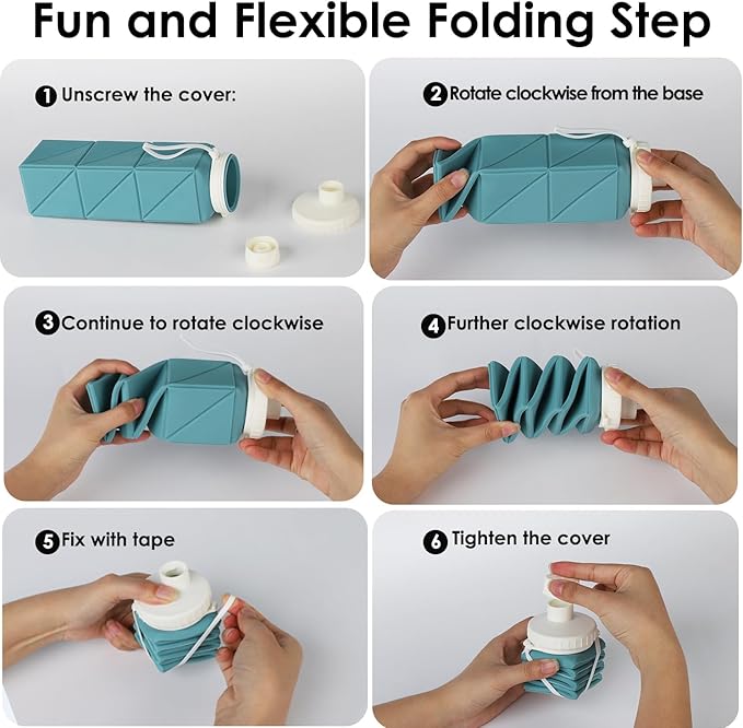 - Here's a step-by-step guide to folding your Fun and Flexible Folding water bottle: Unscrew the cover: Start by unscrewing the cover of the water bottle to open it up. Rotate clockwise from the base: Next, rotate the base of the bottle clockwise. Continue to rotate clockwise: Keep rotating the base clockwise. Further clockwise rotation: Continue rotating the base clockwise until the bottle is fully folded. Fix with tape and Tighten the cover.