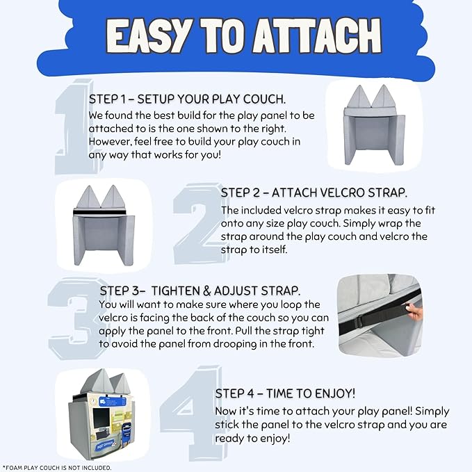 - ADJUSTABLE VELCRO STRAP - Each panel comes with an adjustable velcro strap. The strap makes it easy to wrap around play couches of all sizes. Don't have a play couch? Let your kids use couch cushions to build their forts!