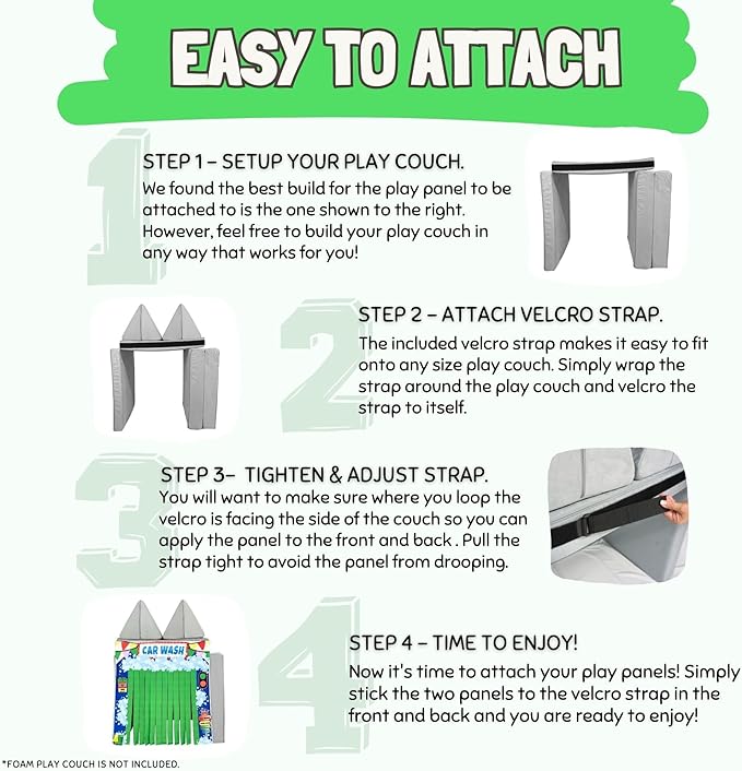 - ADJUSTABLE VELCRO STRAP - Each panel comes with an adjustable velcro strap. The strap makes it easy to wrap around play couches of all sizes. Don't have a play couch? Let your kids use couch cushions to build their forts!