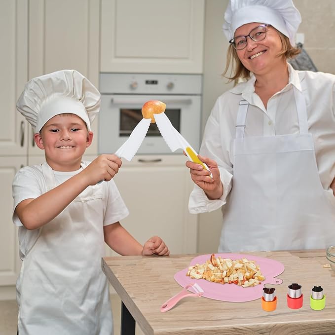 - Package Contents: The Montessori kitchen tool set includes 4 serrated edge toddler knives, 1 fishtail wooden knife, 1 pair of gloves, 1 fruit peeler, 1 big yellow cake mold, 3 small fruit cutter shapes (split design), 1 apple shape cutting board, 1 crinkle cutter and 1 pink storage bag.
