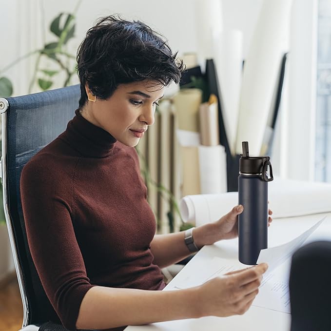 Volhoply 24oz Insulated Water Bottle With Straw Bulk 3 Pack,Metal Wide Mouth Water Bottles With Handle Lid Keep Cold,Reusable Double Wall Thermos,Powder Coated Sport Bottle For Holder(Navy,3 Count)