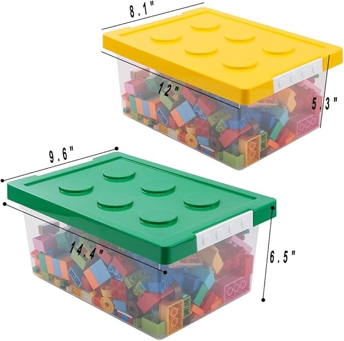 - ❤SET OF 2 STORAGE BINS - The package includes two different sizes toy storage organizer bins with lid. Large bin with green lid: 14.4'' x 9.6'' x 6.5''; Small bin with yellow lid: 12'' x 8.1'' x 5.3''. Plastic bins for storage for kids are luxuriously selected high-quality PP material, without any harmful ingredients. Completely healthy and safe, your baby and family can use them with peace of mind.