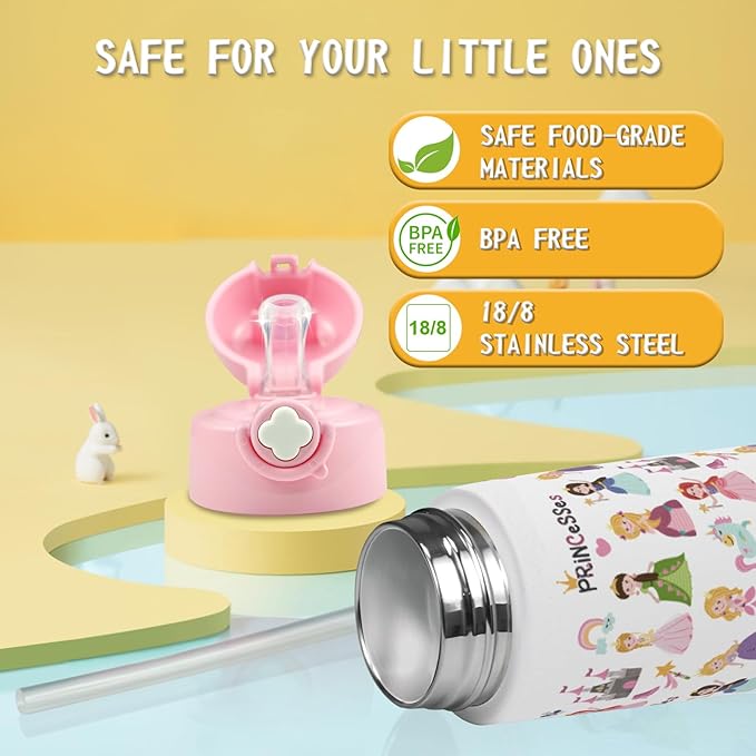 - SAFE FOOD-GRADE MATERIALS:The cup body is made of 18/8 stainless steel,The straw of the kids water bottle is made of food-grade silicone,which is soft and does not hurt the baby's mouth. The straw lid is tightly sealed, effectively preventing water leakage and dust entry, and providing a safe drinking environment for your little one