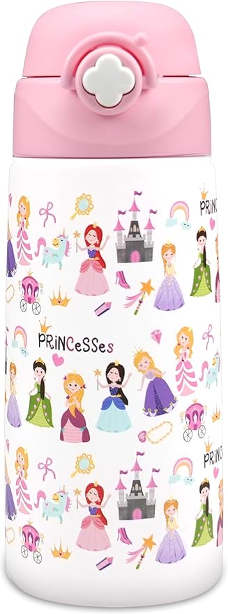 Kids Insulated Water Bottle with Covered Pop-Up Straw,16oz Kids Cups with Stainless Steel Leak Proof for School Boys Girls(2-Princess)