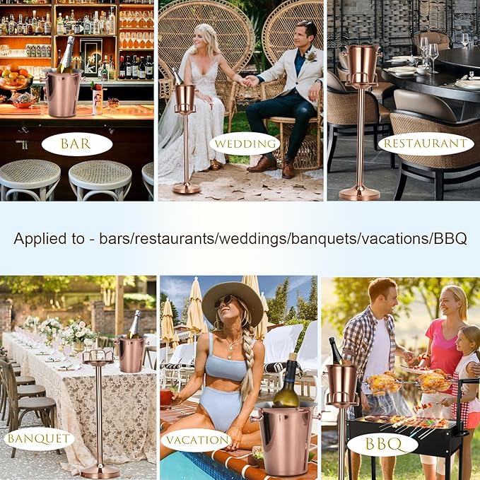 • 【Detachable bracket】A champagne ice bucket with a stand will not occupy the space on the desktop. Of course, you can remove the red wine cooler from the ice bucket stand. This standing ice bucket is not only suitable for indoor use, but can also be moved to outdoor use
