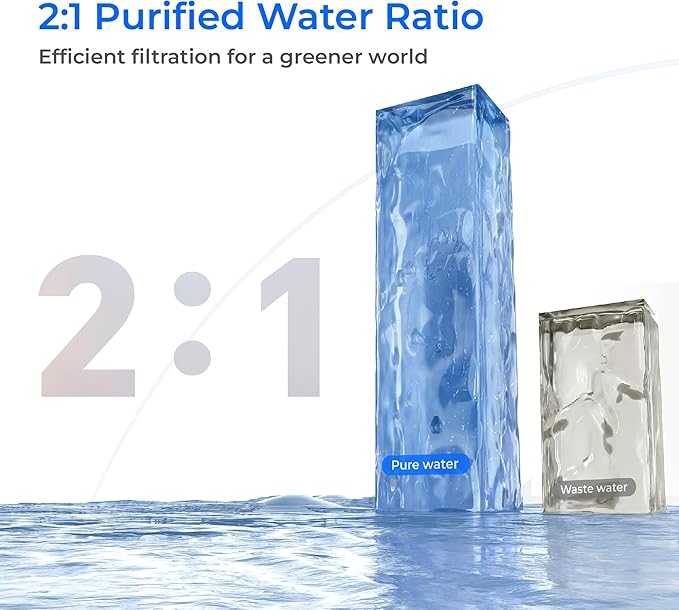 - 【Efficient & Sustainable】 By its 2:1 low drain ratio, this system can produce only one cup of wastewater for every two cups of pure water, which is ideal for daily drinking and cooking.