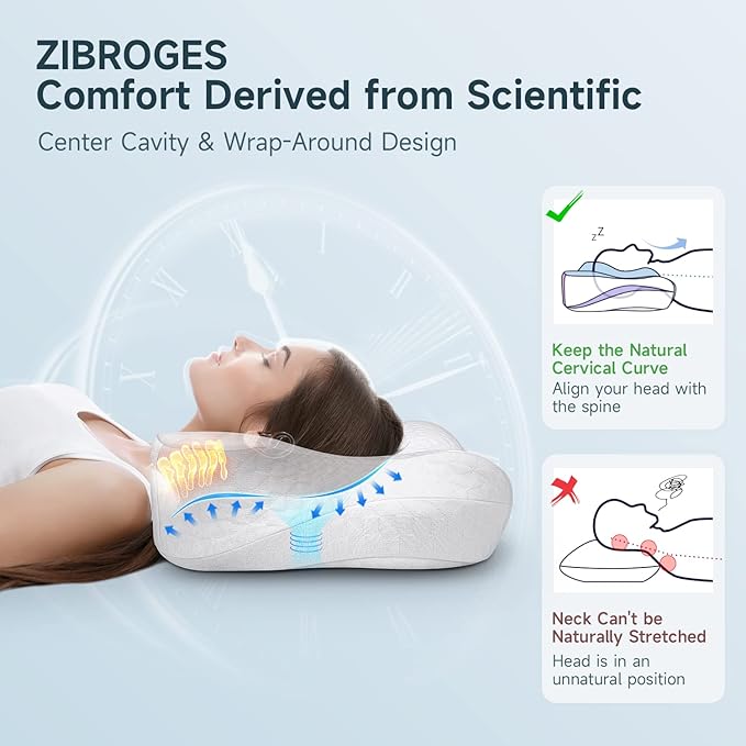 - Neck Pain While Sleeping? - Our tried and tested contour design perfectly supports your head, neck, shoulders, and back. The innovative ergonomic design of the ZIBROGES Memory Foam Pillow for Neck Head Shoulder Pain Relief Sleeping Supports Your Head, fits naturally to the curve of your spine, providing proper support for spinal alignment, reducing neck pressure to a minimum, and works for all sleep positions. Our cervical pillow can help alleviate common pain such as neck and back pain!