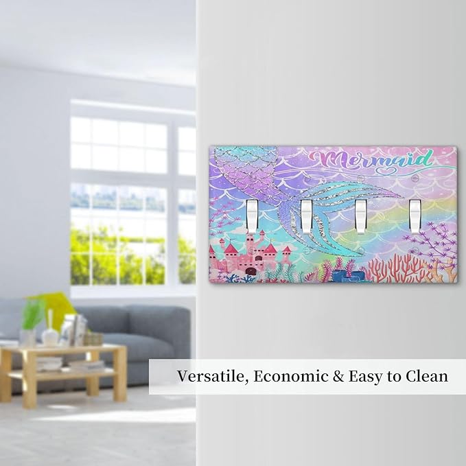 Silvery Glitter Cute Mermaid Tail Fantasy Castle Quad Toggle Light Switch Covers 4 Gang Wall Plate Decorative Switchplate Electrical Faceplate for Kidroom Nursery Bedroom Kitchen Decor
