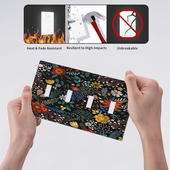 Vintage Colorful Flower Boho Floral Rustic Dark Leaves Quad Toggle Light Switch Covers 4 Gang Wall Plate Decorative Switchplate Electrical Faceplate for Farmhouse Country Bedroom Kitchen Decor