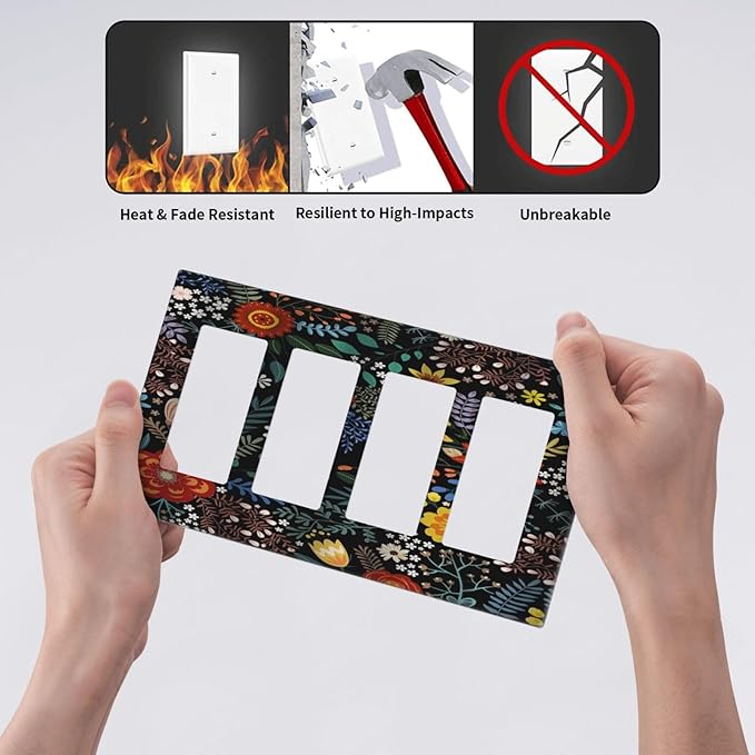 Vintage Colorful Flower Boho Floral Rustic Dark Leaves 4 Gang Rocker Decora Light Switch Cover Outlet Covers Wall Plate Decorative Switchplate Electrical Faceplate GFCI for Farmhouse Bedroom Kitchen