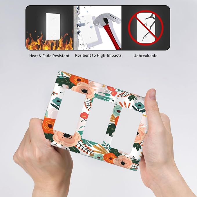 Rustic Floral Boho Colorful Flower 3 Gang Rocker Light Switch Covers Triple Outlet Wall Plate Decorative Switchplate Cover Faceplate GFCI for Farmhouse Bathroom Bedroom Kitchen Decor