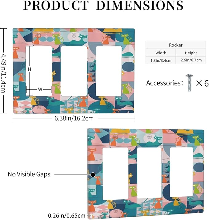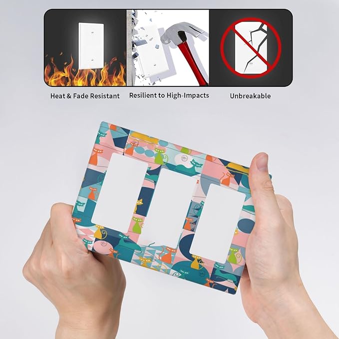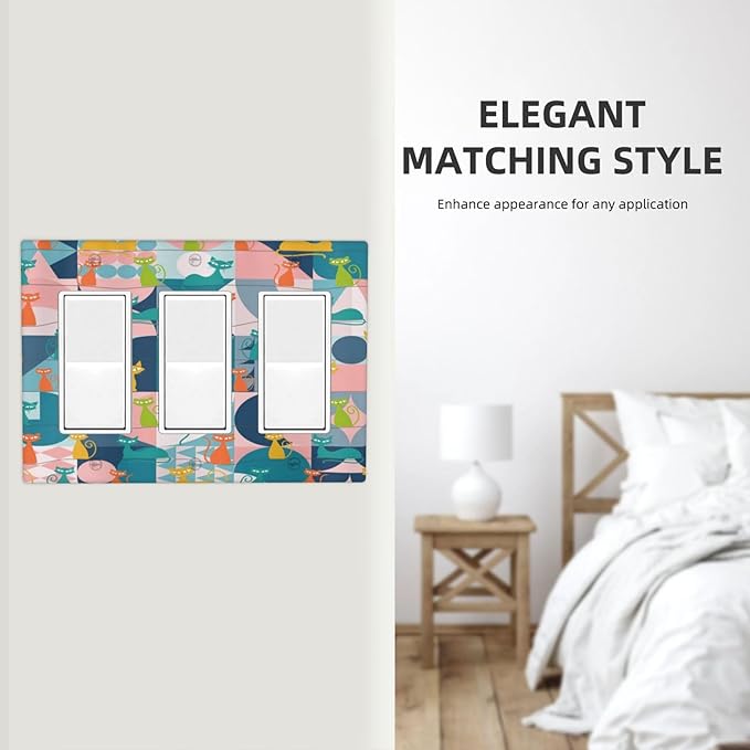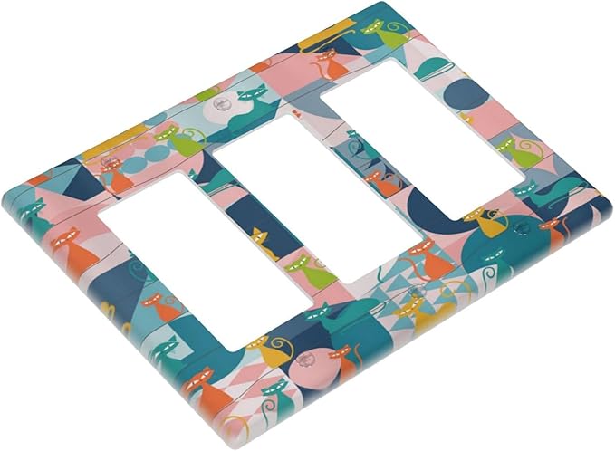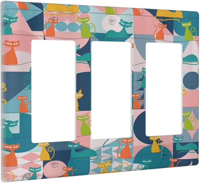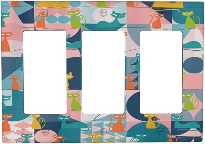 Mid Century Modern Atomic Cute Cats 3 Gang Rocker Light Switch Covers Triple Outlet Wall Plate Decorative Switchplate Cover Faceplate GFCI for Kidroom Nursery Bedroom Decor