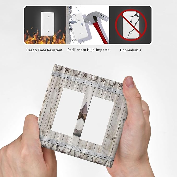 Rustic Western Wood Barn Door Horseshoe Iron Star 2 Gang Rocker Decora Light Switch Covers Dual Outlet Covers Wall Plate Decorative Switchplate Electrical Faceplate GFCI for Farmhouse Bedroom