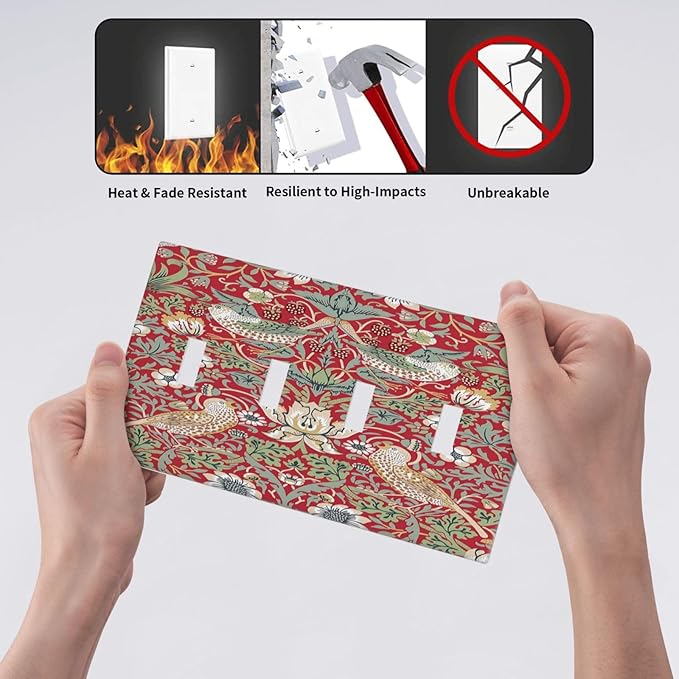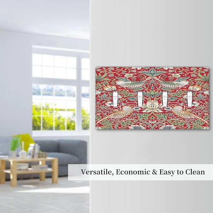 William Morris Strawberry Thief Botanical Red Green Quad Toggle Light Switch Covers 4 Gang Wall Plate Decorative Switchplate Electrical Faceplate for Country Bathroom Bedroom Kitchen Decor