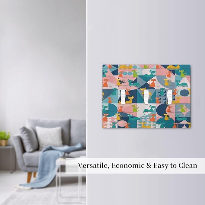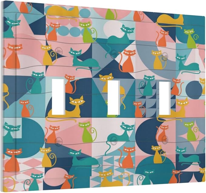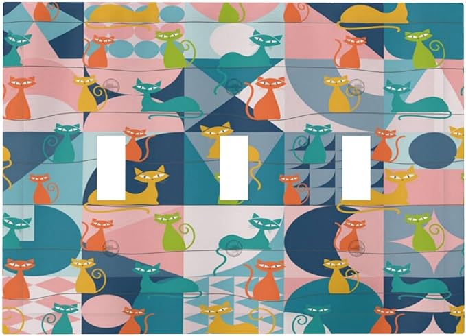 Mid Century Modern Atomic Cute Cats 3 Gang Light Switch Covers Triple Toggle Wall Plate Decorative Switchplate Electrical Faceplate for Kidroom Nursery Bedroom Decor