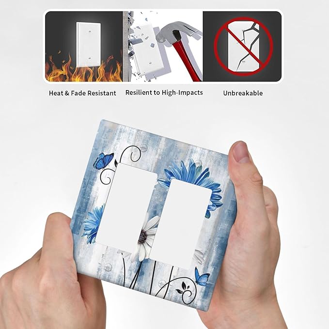 Rustic Teal Blue Daisy Floral 2 Gang Rocker Decora Light Switch Covers Dual Outlet Covers Wall Plate Decorative Switchplate Electrical Faceplate GFCI for Country Bathroom Bedroom Kitchen Decor
