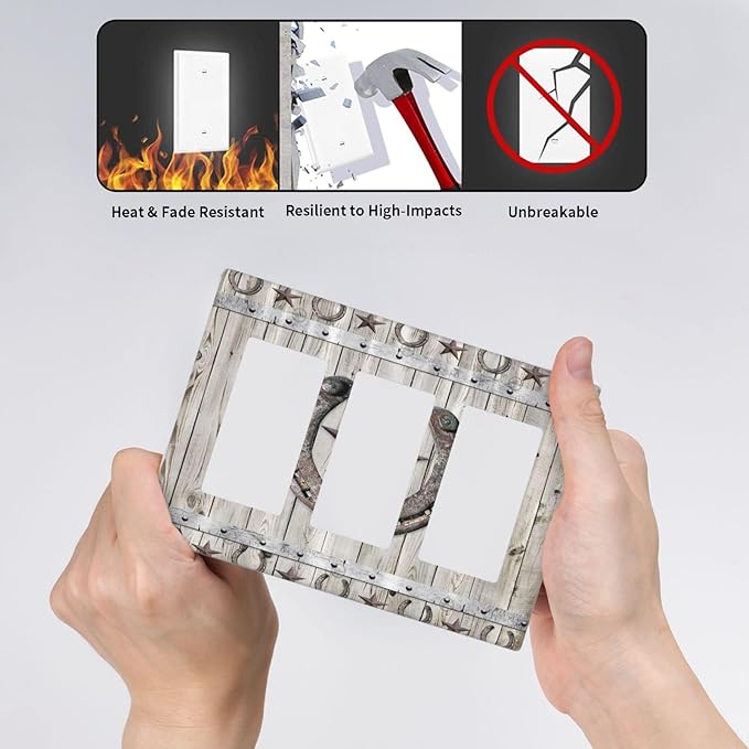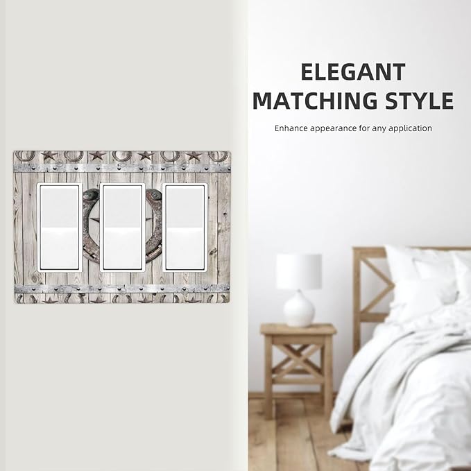 Rustic Western Wood Barn Door Horseshoe Iron Star 3 Gang Rocker Light Switch Covers Triple Outlet Wall Plate Decorative Switchplate Cover Faceplate GFCI for Farmhouse Country Bedroom Decor