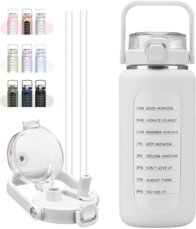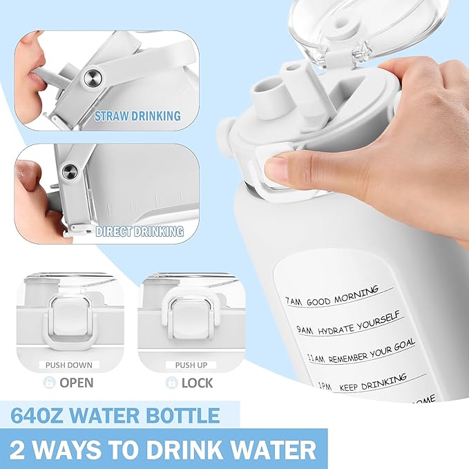 BLUEGO 64oz Insulated Water Bottle with Straw and Handle Leakproof Half Gallon Wide Mouth Motivational Water Bottle, 2-IN-1 Straw Spout Lid Stainless Steel Water Jug for Sport Travel Gym-White