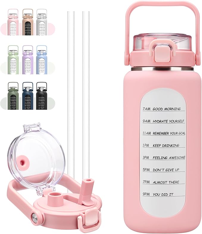 BLUEGO 64oz Insulated Water Bottle with Straw and Handle Leakproof Half Gallon Wide Mouth Motivational Water Bottle, 2-IN-1 Straw Spout Lid Stainless Steel Water Jug for Sport Travel Gym-Pink