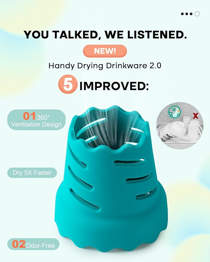 - Fast Air-Drying Rack - Our bottle drying rack features a 360° full-body perforated ventilation design for quickly drying drinking bottles, glassware, and ceramic mugs of various shapes and sizes. By keeping them vertical and off the counter, it enhances drying efficiency. The vibrant color also adds a fun touch to an otherwise mundane task