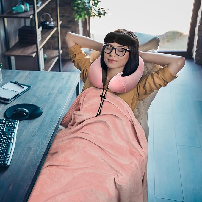 Travel Pillow and Blanket Set Neck Pillows Travel Essentials with Sleep Mask for Airplane Car Memory Foam Pink