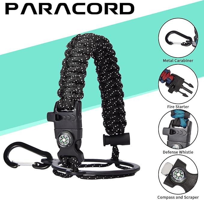 - UNIQUE PARACORD HANDLE: Bright color paracord matches the flask water bottle to give you a youthful vibe while adding a personal style. With a compass, safety loop, metal carabiner, flint, igniter and whistle to become your survival tool, making the 32 oz metal water bottle with paracord an ideal survival kit for expeditions in the wild