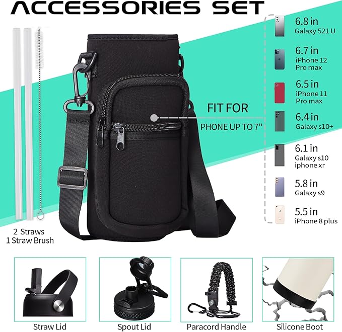 - SUPER JOYFUL COMBO: Buy insulated water bottle 32 oz and get 9 accessories (2 x lids, 1 x survival paracord, 1 x carrying pouch, 1 x shoulder strap, 1 x protective cup mat, 2 x straws, 1 x straw brush). WITH A LIFETIME GUARANTEE, these thermal water bottles are perfect gifts for using at home, work, school, road trips, hiking, sporting events, or just hanging out