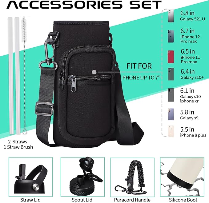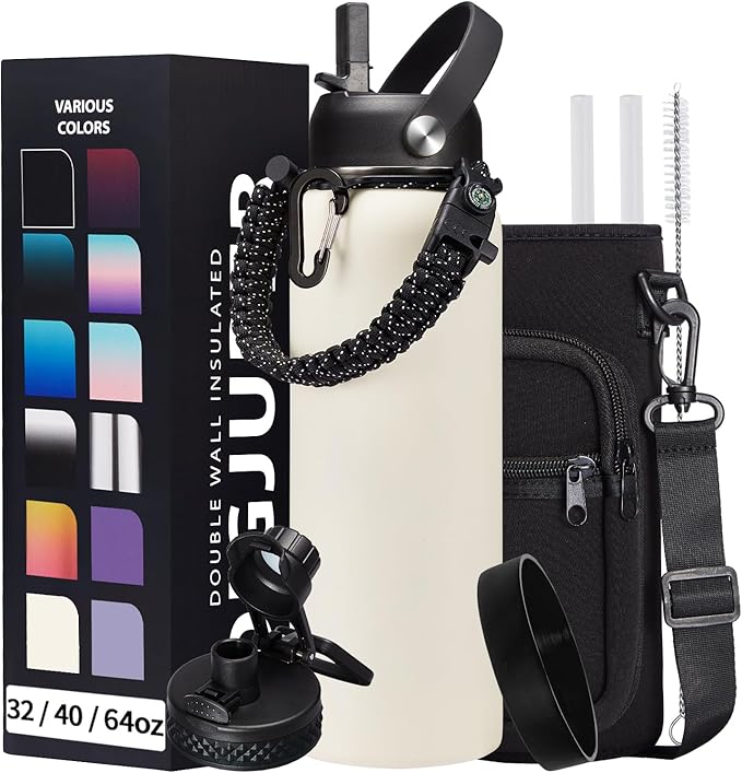 - COMBO—Super Deal: Buy 40oz insulated water bottles and get 9 accessories (2 x lids, 1 x survival paracord, 1 x carrying pouch, 1 x shoulder strap, 1 x protective cup mat, 2 x straws, 1 x straw brush). WITH A LIFETIME GUARANTEE, these metal water bottles are the perfect gift for use at home, work, school, road trips, hiking, sporting events, or just hanging out