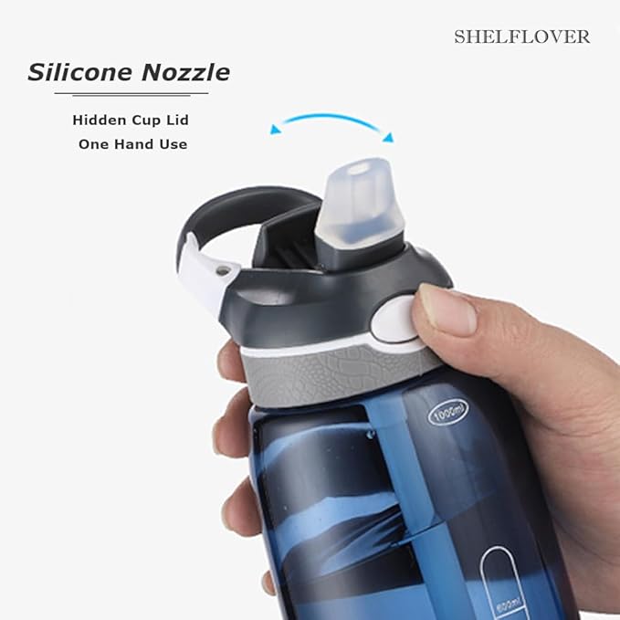 SHELFLOVER Blue Water Bottle With Narrow Straw, BPA FREE Clear Bottles With Handle One Hand Use Easy Carried, Flip Up, Suit School, Office, Gym, Office For Men, 32oz (1000ml)