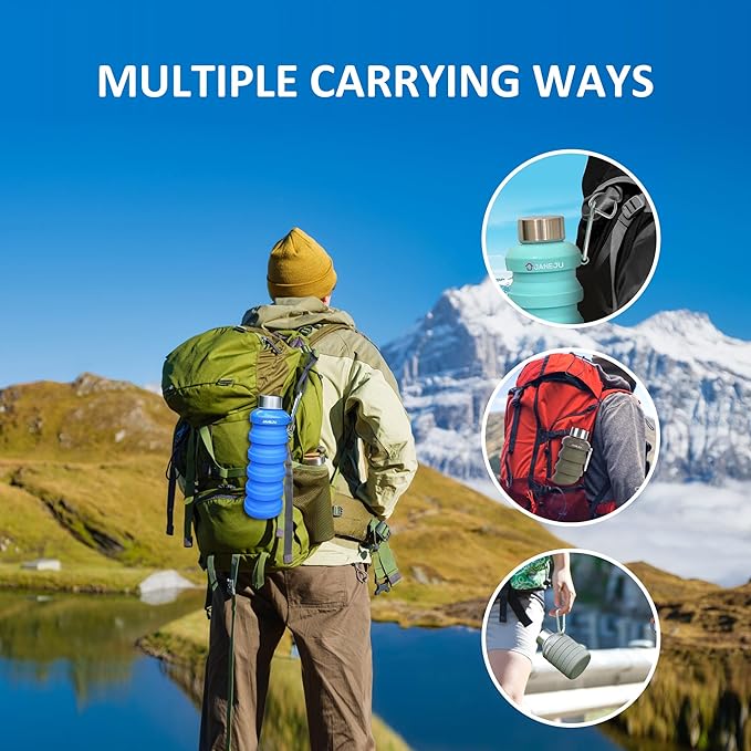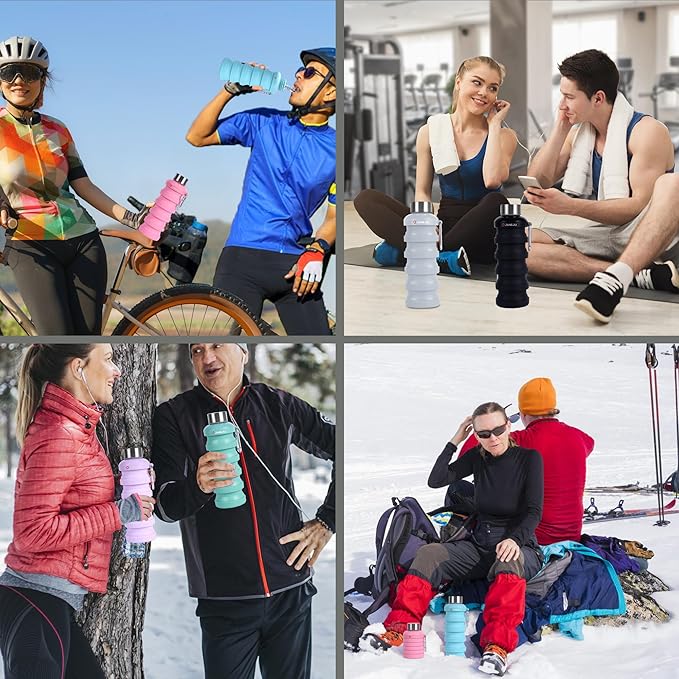 JaneJu Collapsible Water Bottle, 17oz BPA Free Silicone Reusable Portable Lightweight Foldable Water Bottles with Carabiner, Portable Leak Proof Sports Water Bottle (blue&pink)