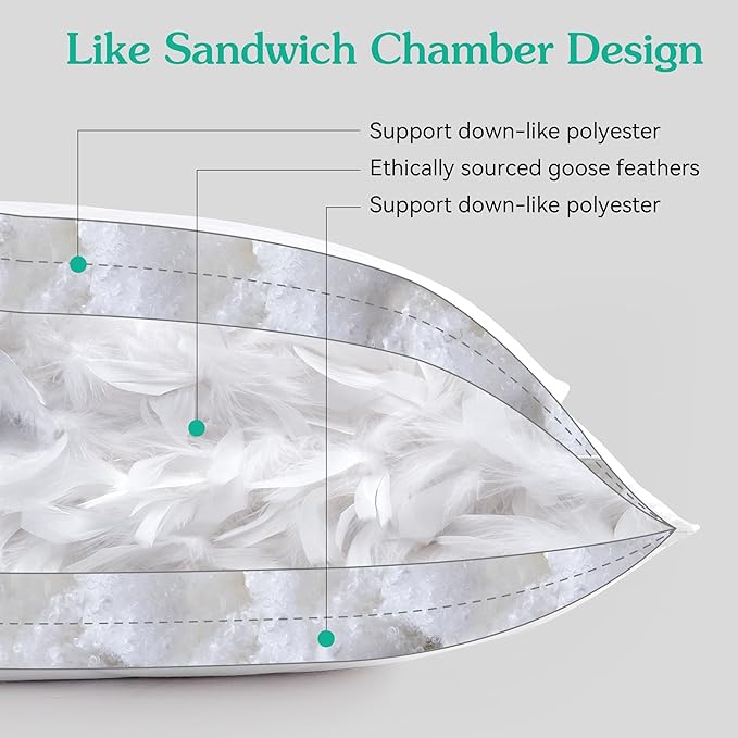 - THREE CHAMBER DESIGN-The pillow has an inner chamber filled with goose feathers, providing support & volume. The two outside chambers are filled with high quality polyester, making them particularly cuddly.