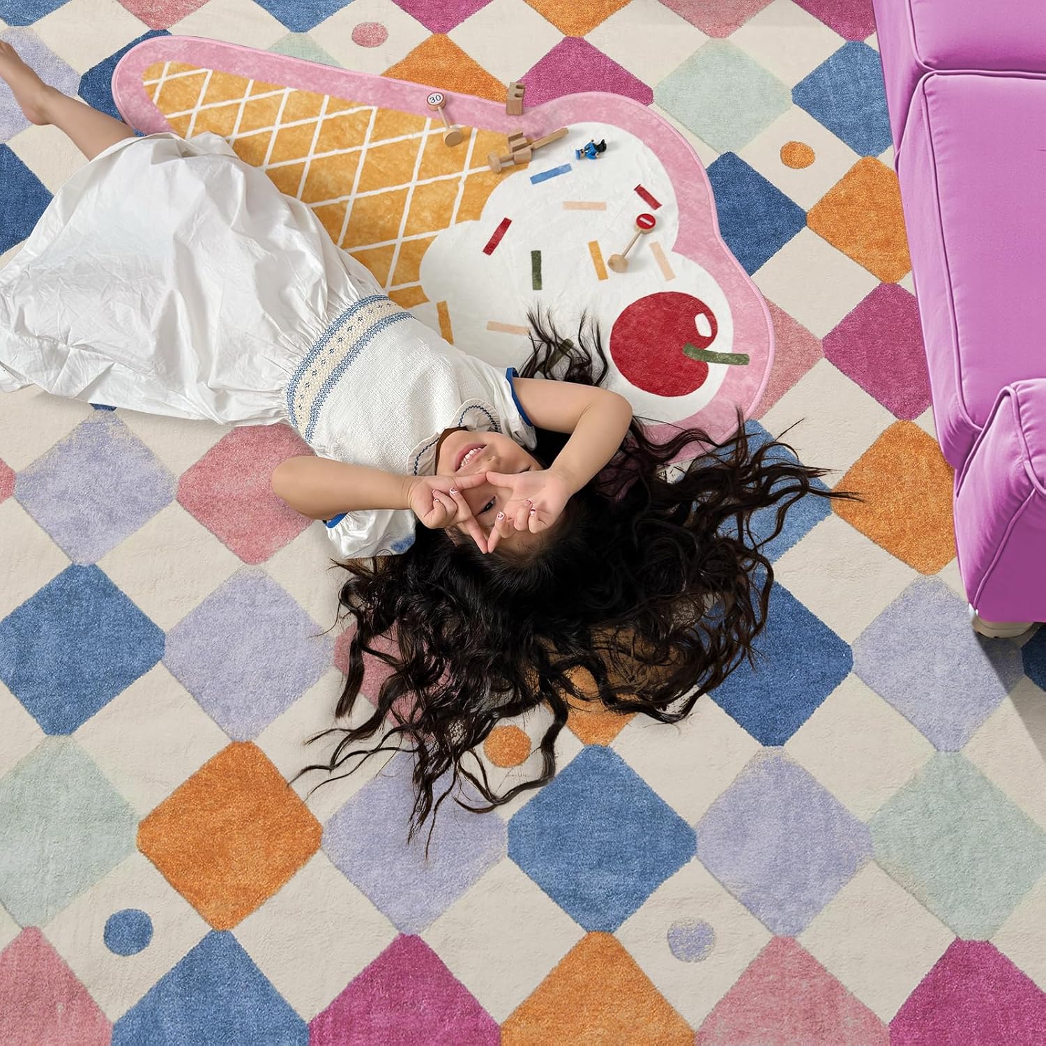 jinchan Area Rug 5x7 Kids Washable Indoor Floor Cover Non-Slip Modern Soft Rug Elementary School Classroom Colorful Diamond Carpet for Nursery Playroom Daycare Bedroom Living Room Berries on Cream