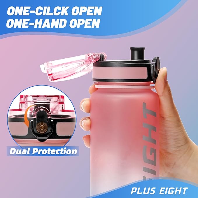 - 🏃🏻♀️💧【FUNCTIONAL DESIGN】: The flip-top lid is designed with a secure lock, effectively prevent dust and leakage. The bottle with a portable wrist strap makes it convenient for on-the-go hydration. Featured with a frosted and translucent appearance helps you measure your daily water intake. Wide-mouth opening designed makes the sports water bottle easy to fill with ice cubes and fruits, perfectly meet your different needs.